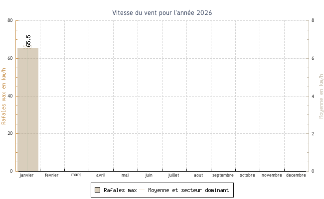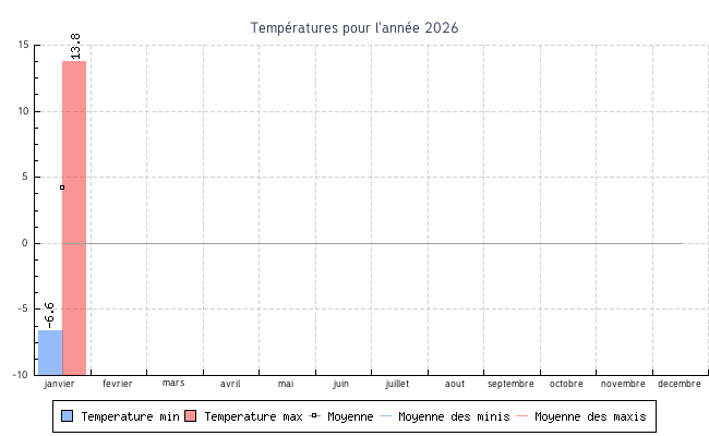 | janvier | -6.6 °C | 0.8 °C | 13.8 °C | 7.9 °C | 4.2 °C | 7.0 km/h | 65.5 km/h | SSO |